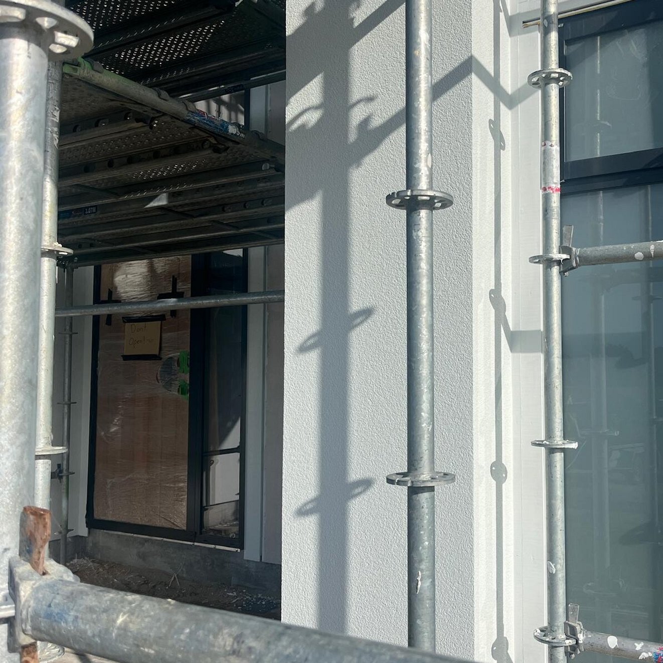 Exterior entry plastering is complete.