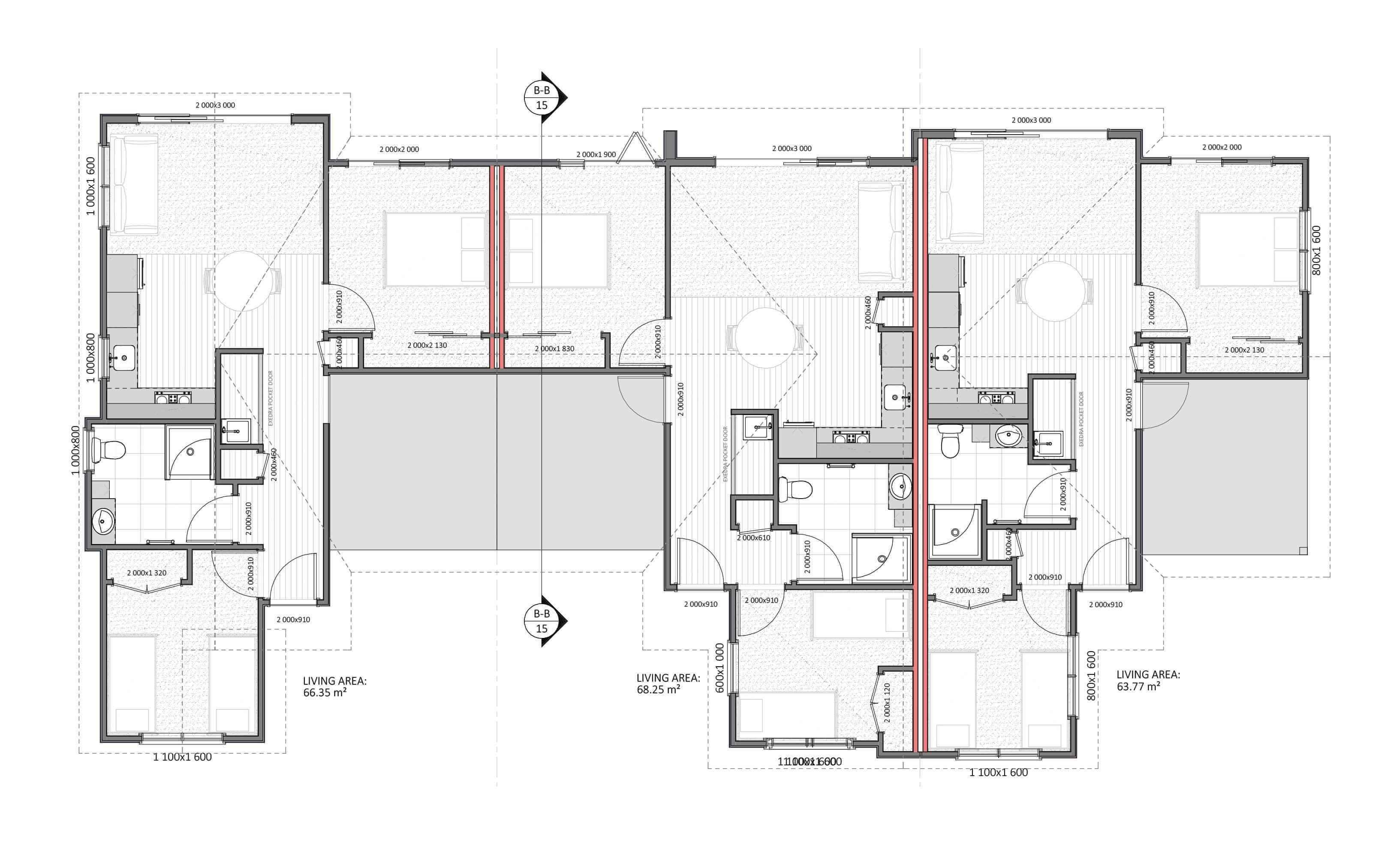 The project comprises four duplex buildings across eight lots. Each home offers approximately 107m² to 113m² of living area and includes: